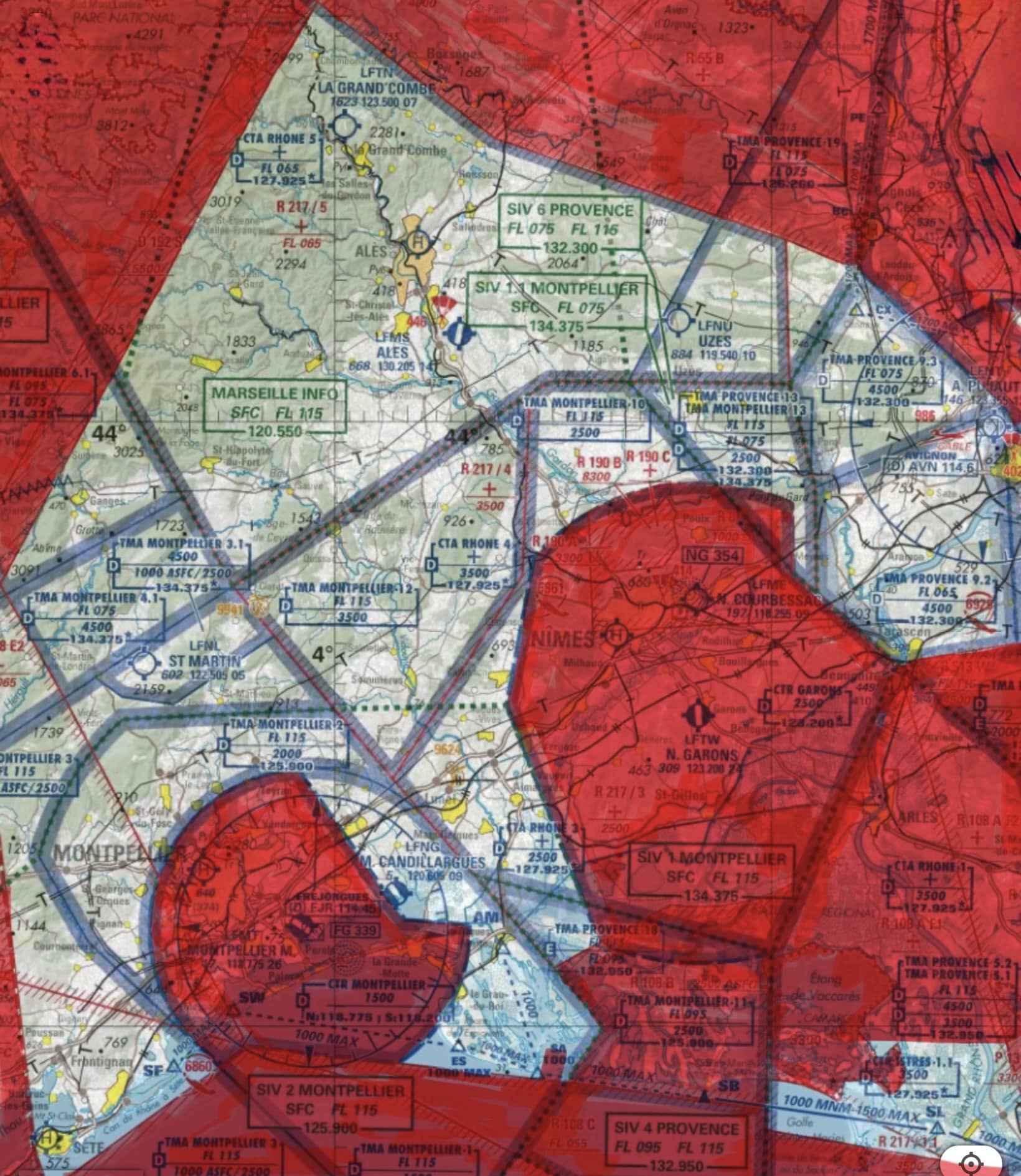 Explorez un aperçu de la carte OACI ci-dessous. En rouge les zones qui ne permettent pas la pratique du paramoteur ! (Réserves naturels, zone militaire, zones contrôlées de trafic pour l’aviation commercial).